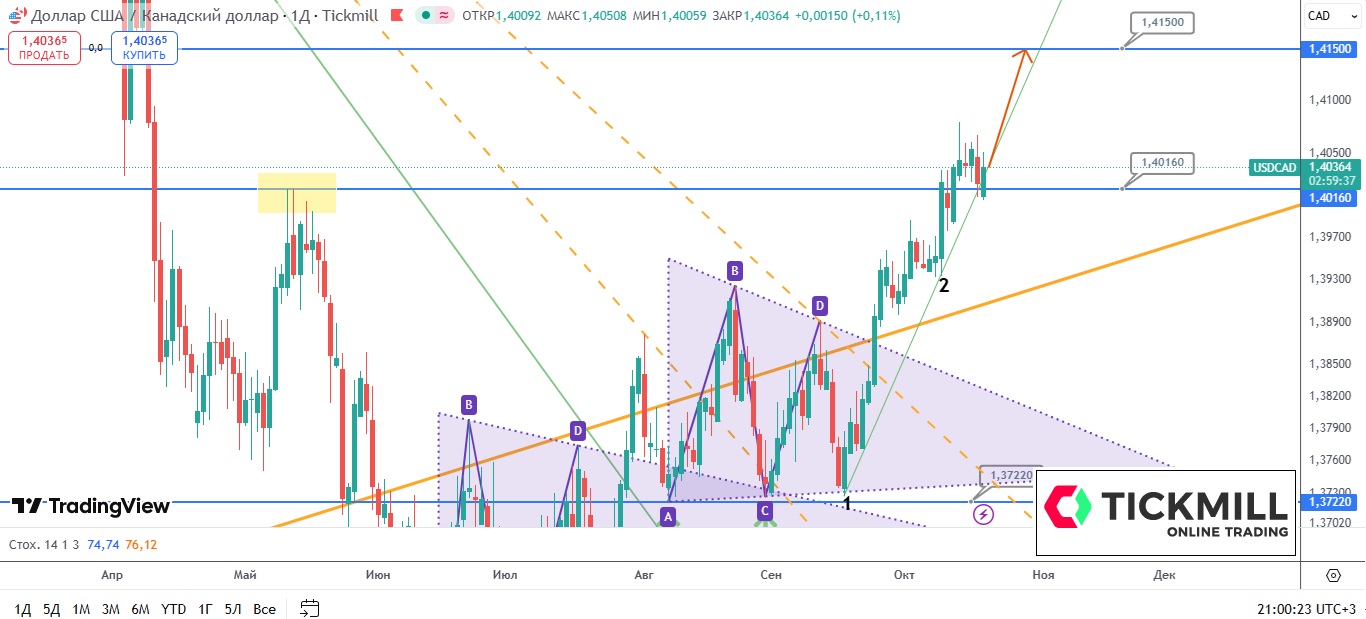 «Канадец» закрывает понедельник отбоем от пробитого ранее уровня 1.4016, формируя при этом свечную формацию «просвет в облаках», а также отбоем от локальной восходящей линии тренда (точки 1 и 2). Покупатели продолжают удерживать преимущество, поэтому потенциал роста котировок сохраняется, и при реализации «северного» сценария внимание рынка может быть сосредоточено на на уровне сопротивления 1.4150.